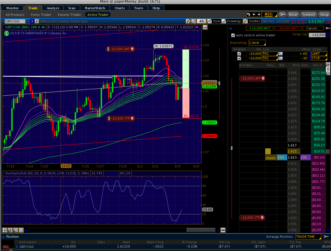 The emas just give you a visual. The more fanned out they are, the stronger the trend is. 2 emas would not show at a glance the trend strength. I want to post a couple trades I just entered. With these set ups I use boxes to give a visual for the R/R. On the 4hr its only a 1/1. I am using a 10k account size so based on the 2% rule I could only take a 10k lot size. Target for the 4hr was 1.63731 Entry was 1.61291 Stop was 1.59223 Target minus Entry = 244 pips Entry minus Stop = 207 pips equals a R/R of 2.4% to 2.07% Which is a 1/1 in my book. For the 1hr Target = 0.91832 Entry = 0.91370 Stop = 0.91022 Target minus Entry = 50 pips Entry minus Stop = 35 50 pips of gain vs 35 pips of loss R/R = 1 Account Size = $10,000 , $200 = 2% 35 pips x 50k lot = $175 of loss. So that was my size for this trade. 50 pips x 50k lot = $250 of potential gain.